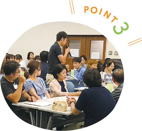 年数回、外部講師をお呼びして継続的にスキルアップできる法人研修を行っています。また、川崎市が主催する研修会にも参加して、造形や音楽、食育、健康など幅広い分野の勉強をすることができます。