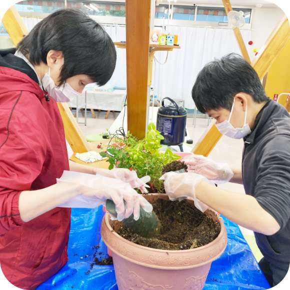 知的な障がいがある方に、作業的な活動や日中の活動スペースを提供し、一人ひとりが地域の中で生き生きとした生活をおくることができるよう支援します。また、一般浴と特殊浴の設備を整え、自宅での入浴が困難な利用者さんへの入浴サービスも行います。